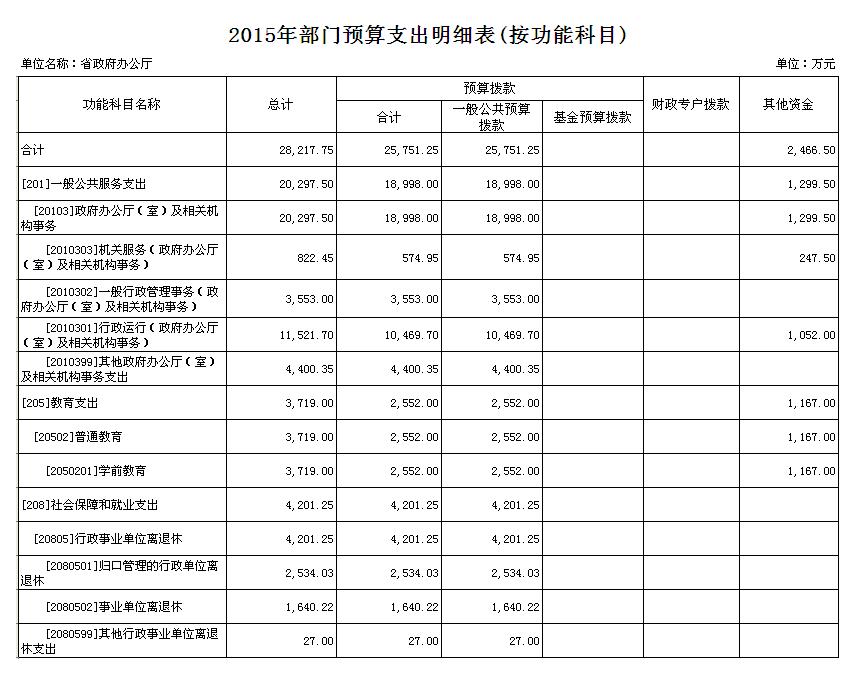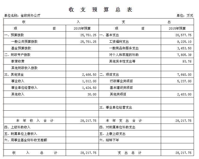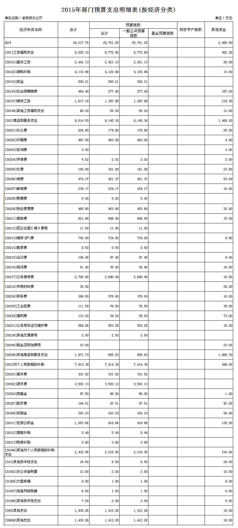 2015年支出预算28,217.75万元,其中:基本支出20,577.75万元,占预算拨款支出的72.92%;项目支出7,640.00万元,占预算拨款支出的27.08%。(支出明细详见附表)