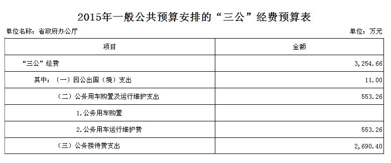 2015年一般公共预算安排的“三公”经费预算数为3,254.66万元,其中:因公出国(境)支出预算11.00万元;公务用车购置及运行维护支出预算553.26万元(本年度此项支出预算全部为公务用车运行维护费);公务接待费支出预算2,690.40万元。